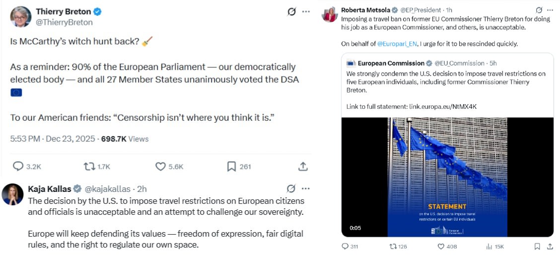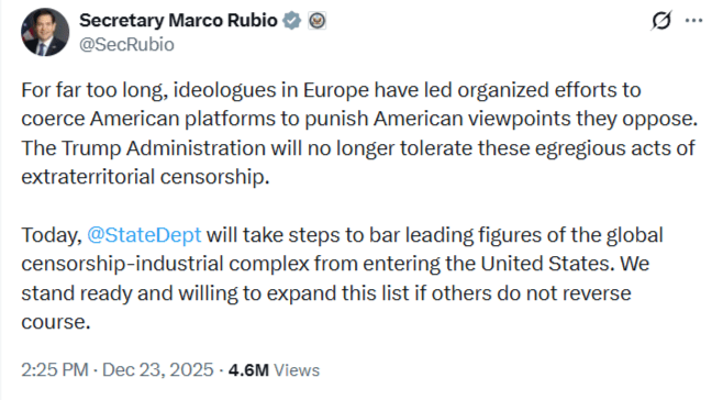 Eergisteren kondigde de VS voor het eerst sancties aan tegen Europese functionarissen die betrokken zijn bij de Digital Services Act van de EU en de Online Safety Act van het Verenigd Koninkrijk, en met name vanwege hun pogingen om Amerikanen extraterritoriaal op Amerikaans grondgebied te censureren.